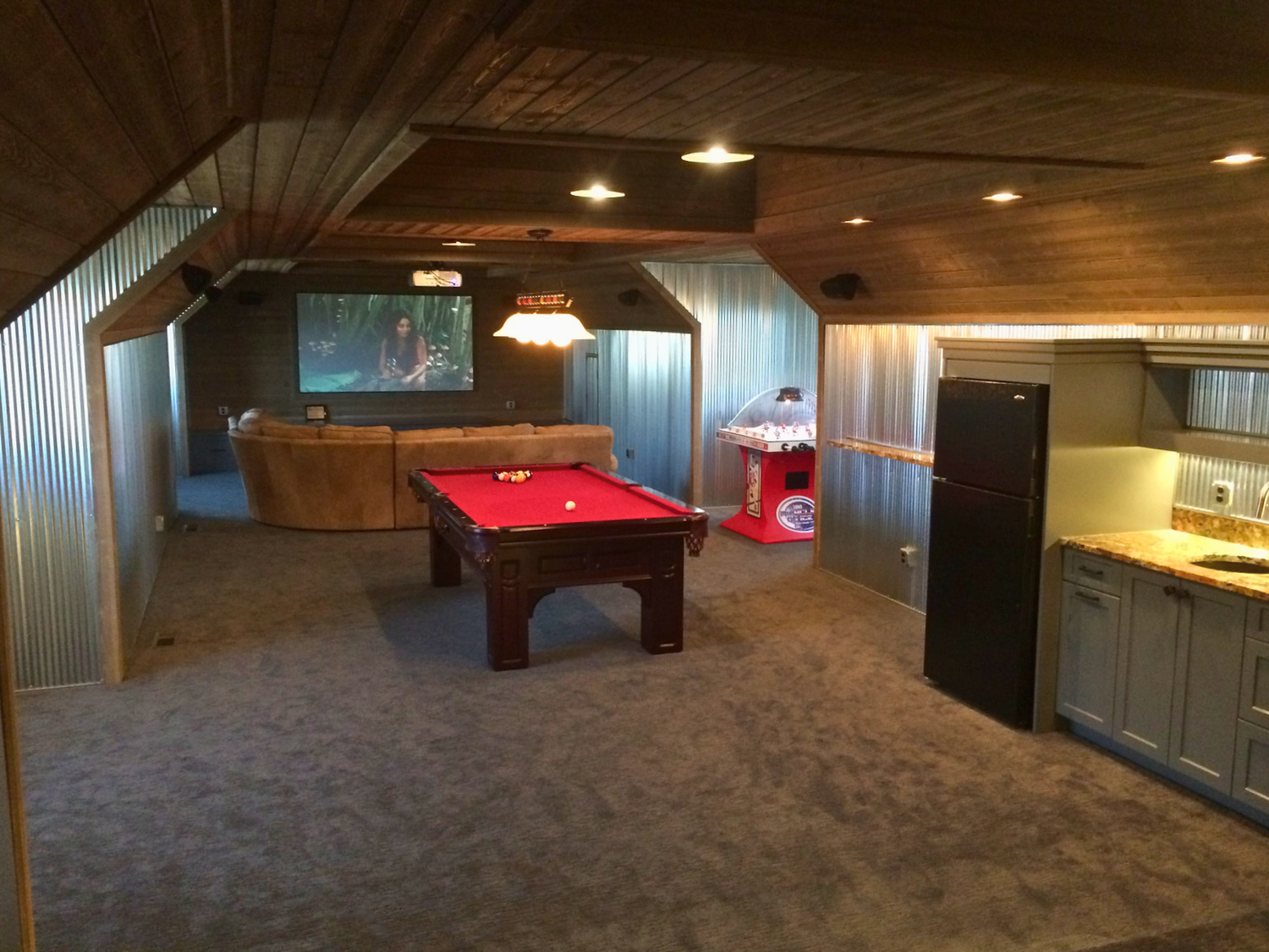 This photo is a prime example of what a man cave can be! We installed a bubble hockey table, billiards table, and home theater area in the back.