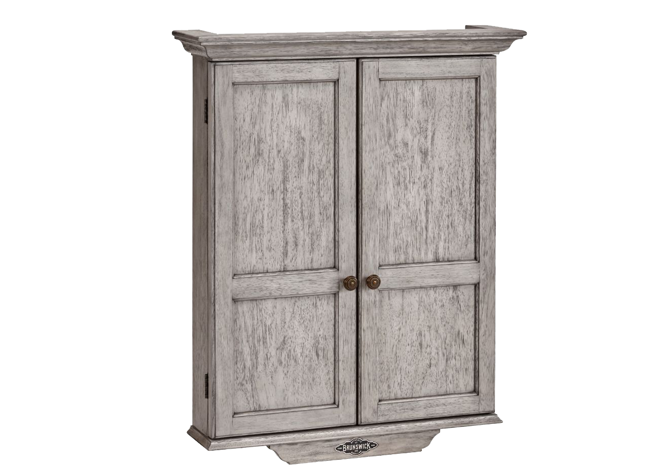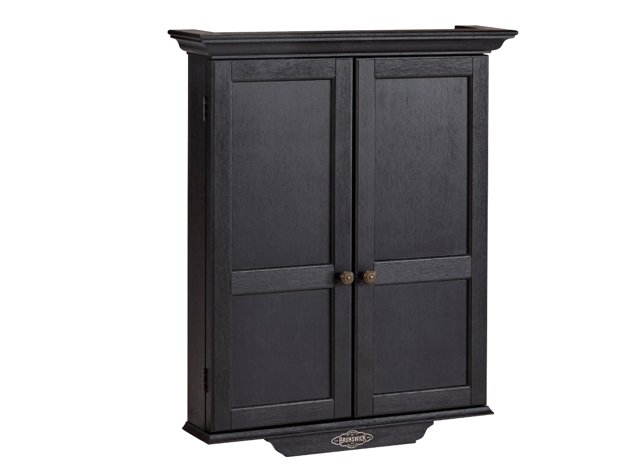 The Brunswick dartboard cabinet is a great addition to any game room and provides the best solution for keeping your game organized and your walls protected. Its cabinet doors feature double chalk scoreboards, magnetic catches, chalk groove and dart holders for storage. Features a cork backboard for steel-tip darts. Cabinet holds most steel- and soft-tip darts. Constructed of hardwood and hardwood veneers with antique bronze hinges and cabinet door knobs.