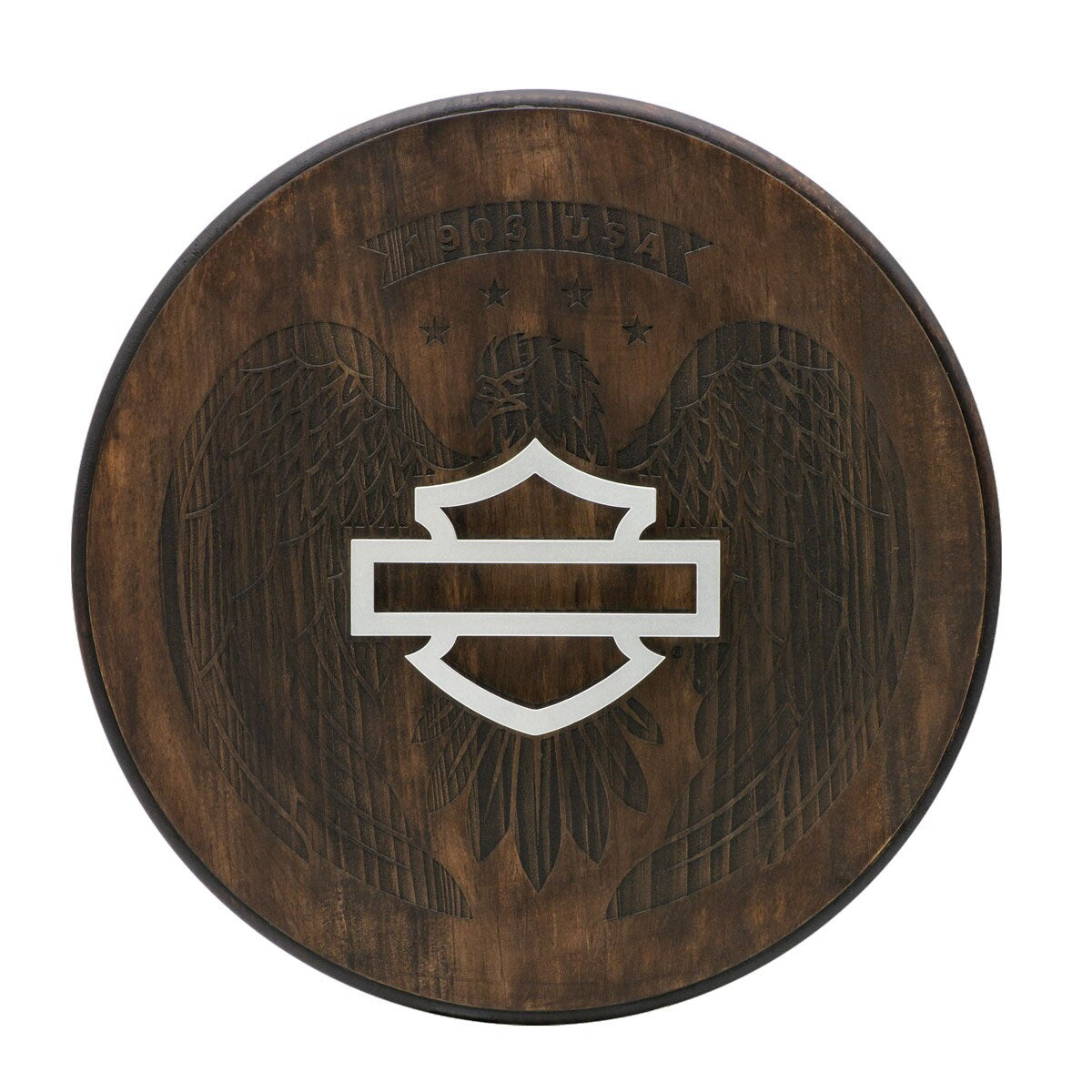 Round wood pub sign featuring laser engraved Open Bar & Shield Eagle graphic and raised metal Open Bar & Shield logo.