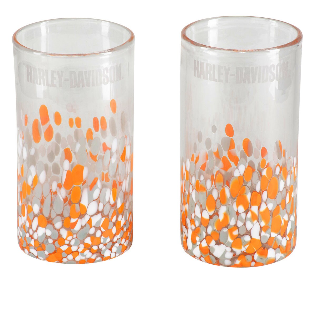 Set of two 16 oz. / 480 ml highball glasses. Thick hand handblown glass with orange and grey confetti and etched Harley-Davidson font on the rim. Hand wash only.