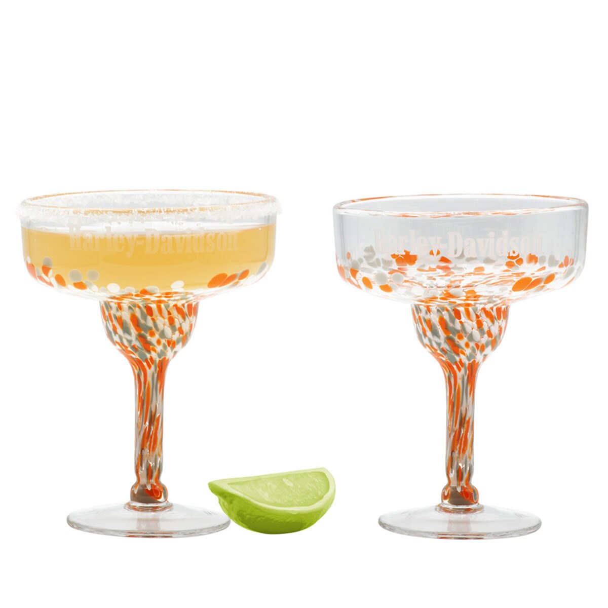 Set of two 15 oz. / 450 ml margarita glasses. Thick hand handblown glass with orange and grey confetti and etched Harley-Davidson font on the rim. Hand wash only.