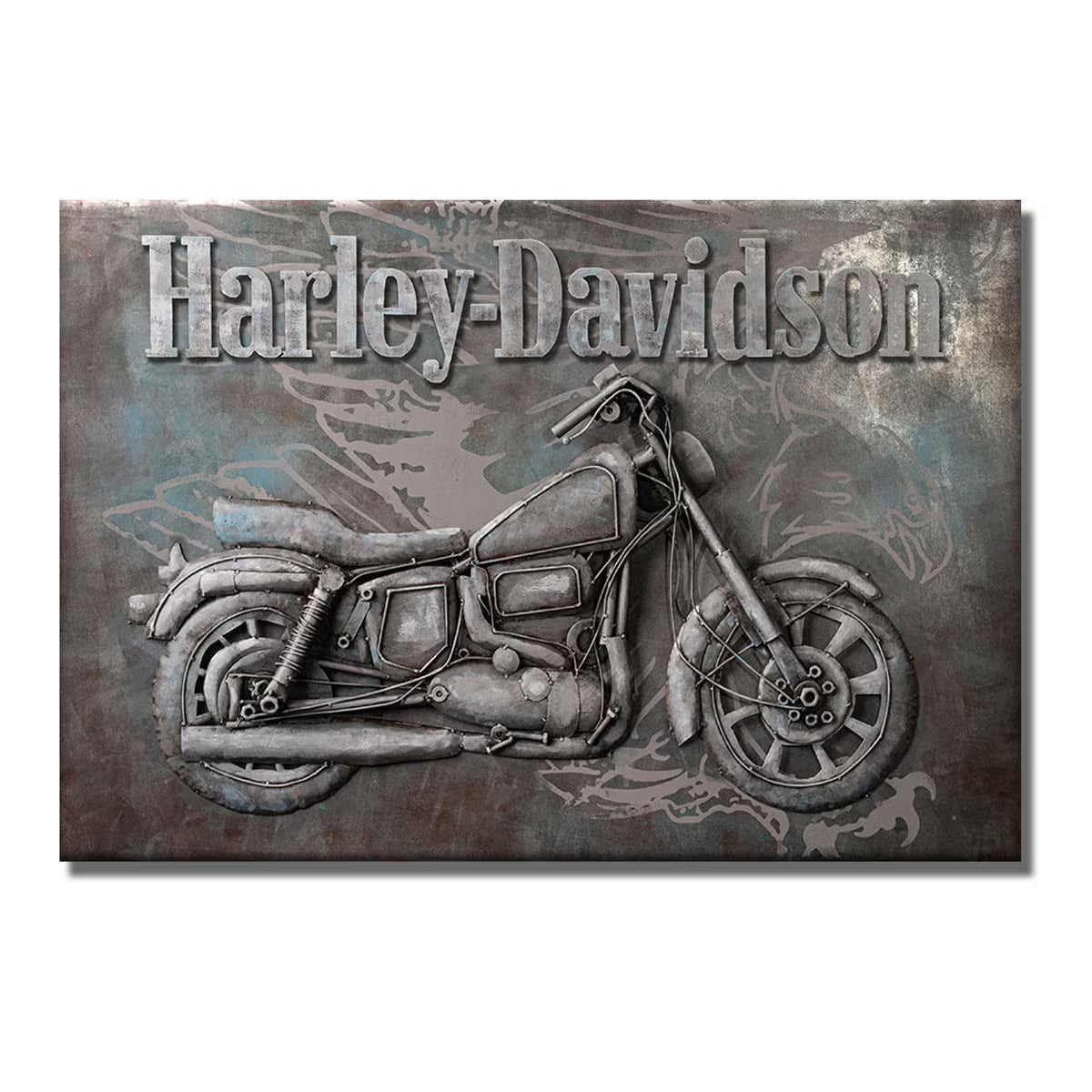 Each piece is hand crafted from repurposed steel and is truly one-of-a-kind. Features hand cut and formed steel motorcycle design with distressed finish, raised Harley-Davidson logo, and printed swooping eagle in the background.