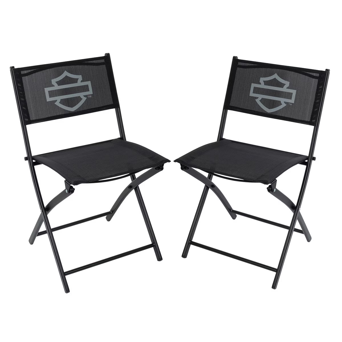 Folding Bistro Set includes one table and two chairs. Table features black metal frame and tempered glass top. Chairs feature metal frame with mesh seat and back. Open Bar & Shield logo on all pieces. Table and chairs fold for easy storage. Chair Weight Limit: 225 lb. / 102 kg