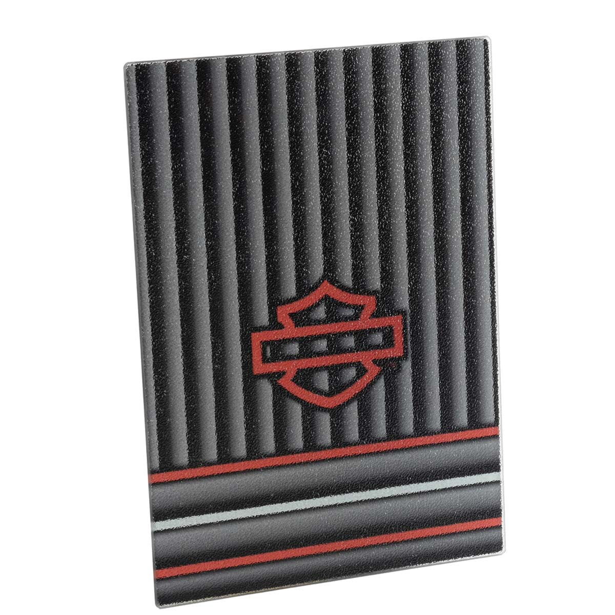 Durable, scratch and shatter resistant tempered glass cutting board with anti-slip pads on bottom. Open Bar & Shield logo on dimensional stripes background. Hand wash only.