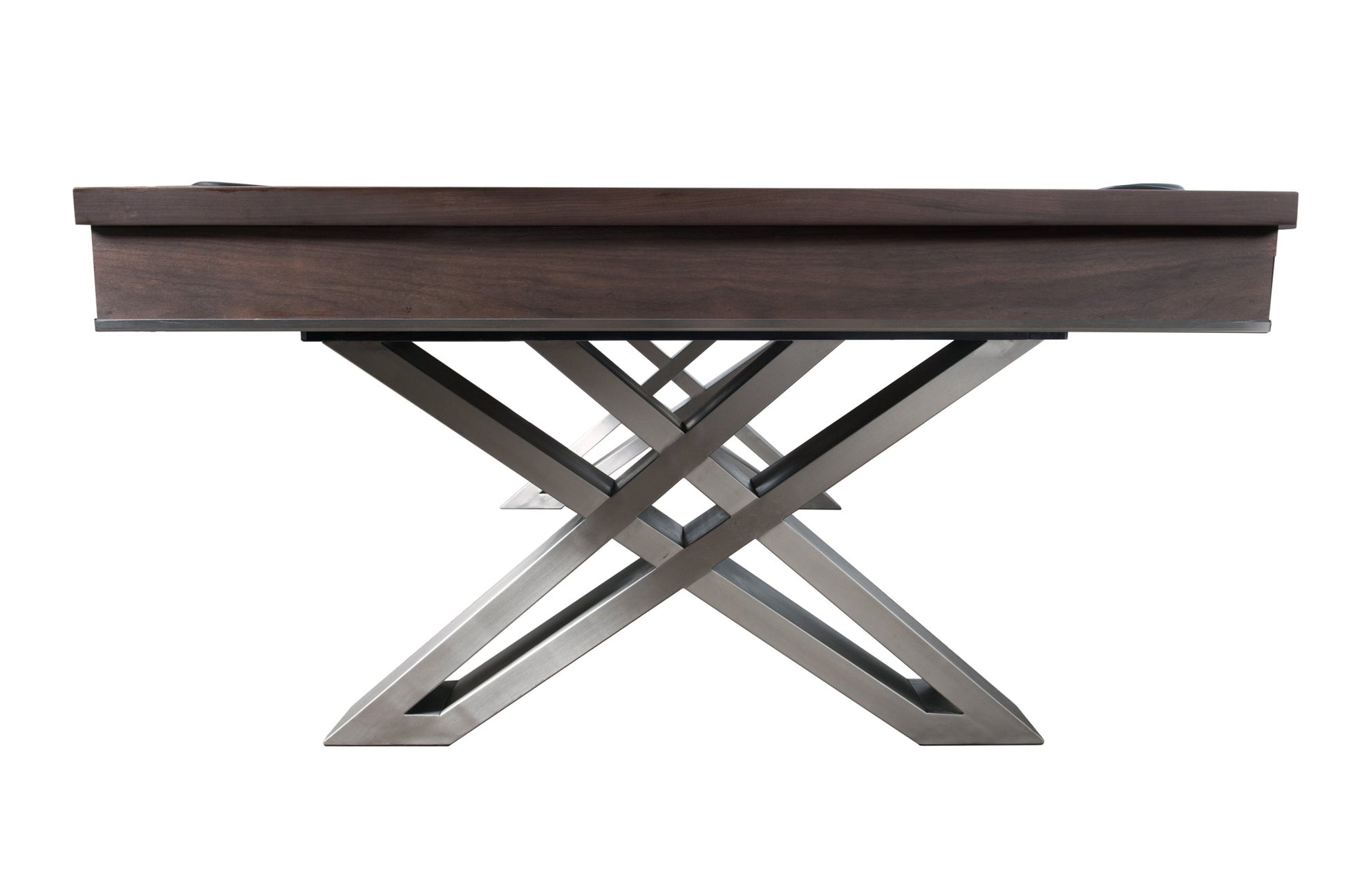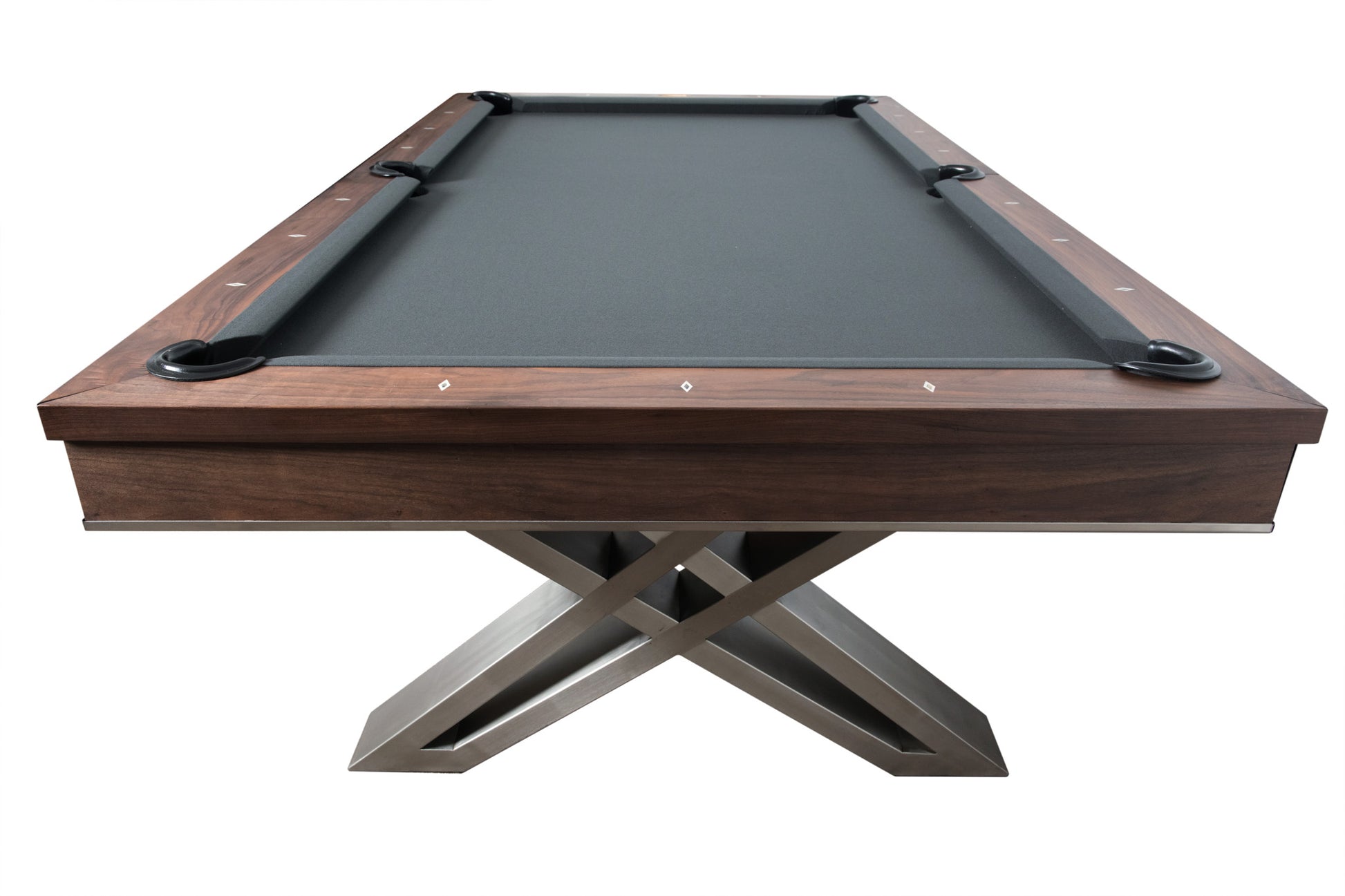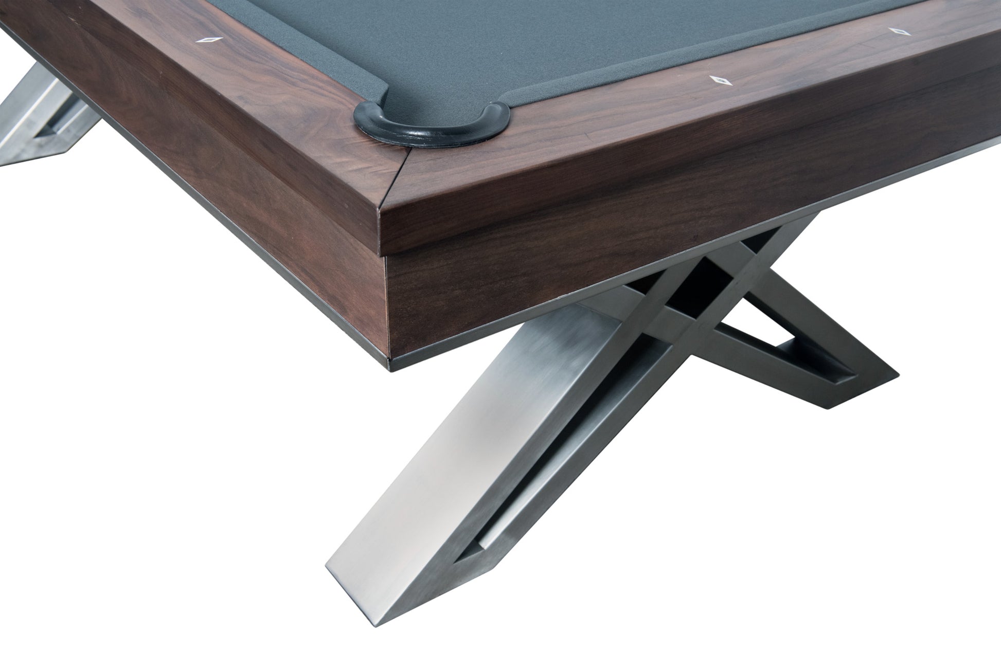 The Pierce is a modern pool table set off by bold stainless-steel legs and comes in a natural walnut finish. Includes standard cloth.
