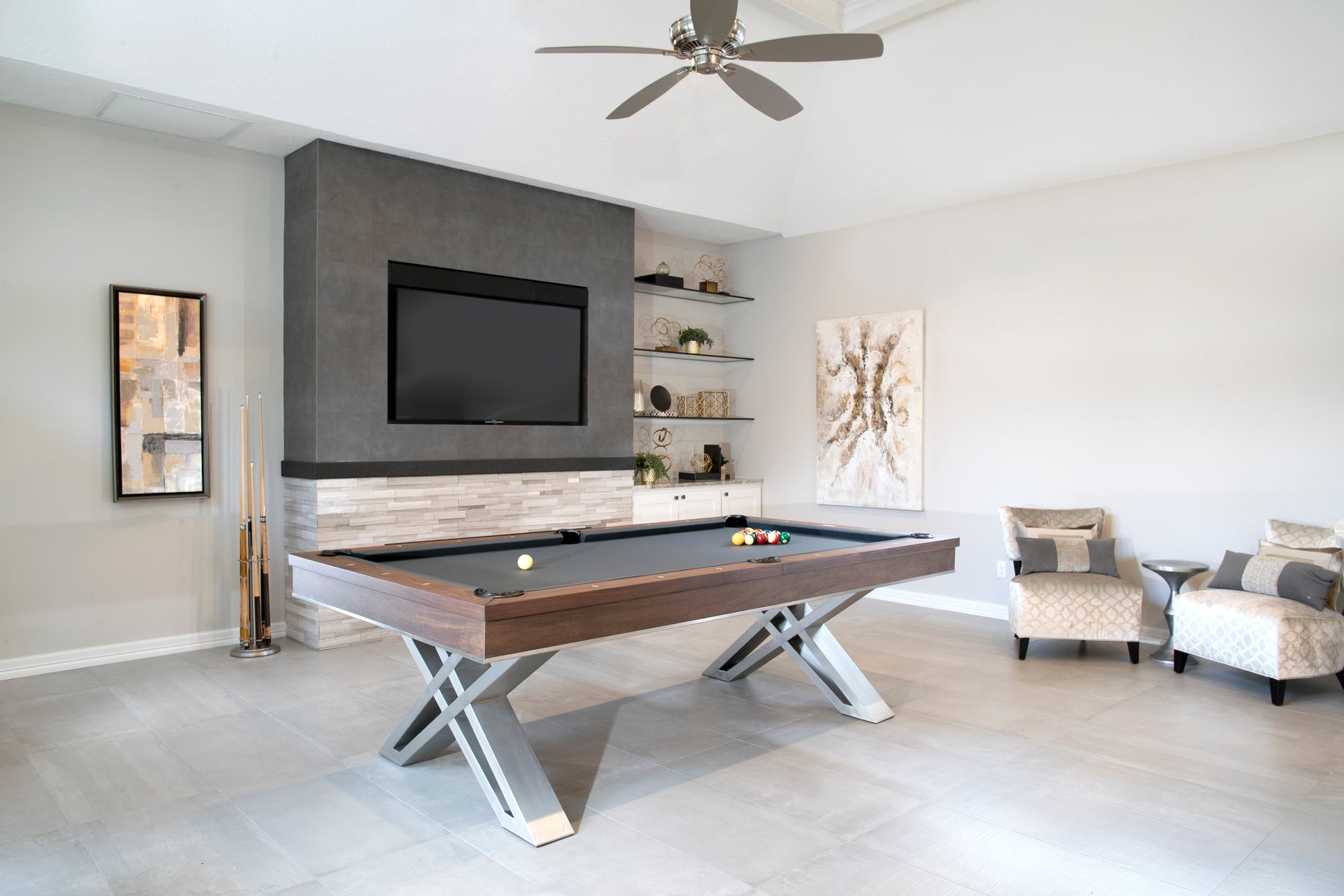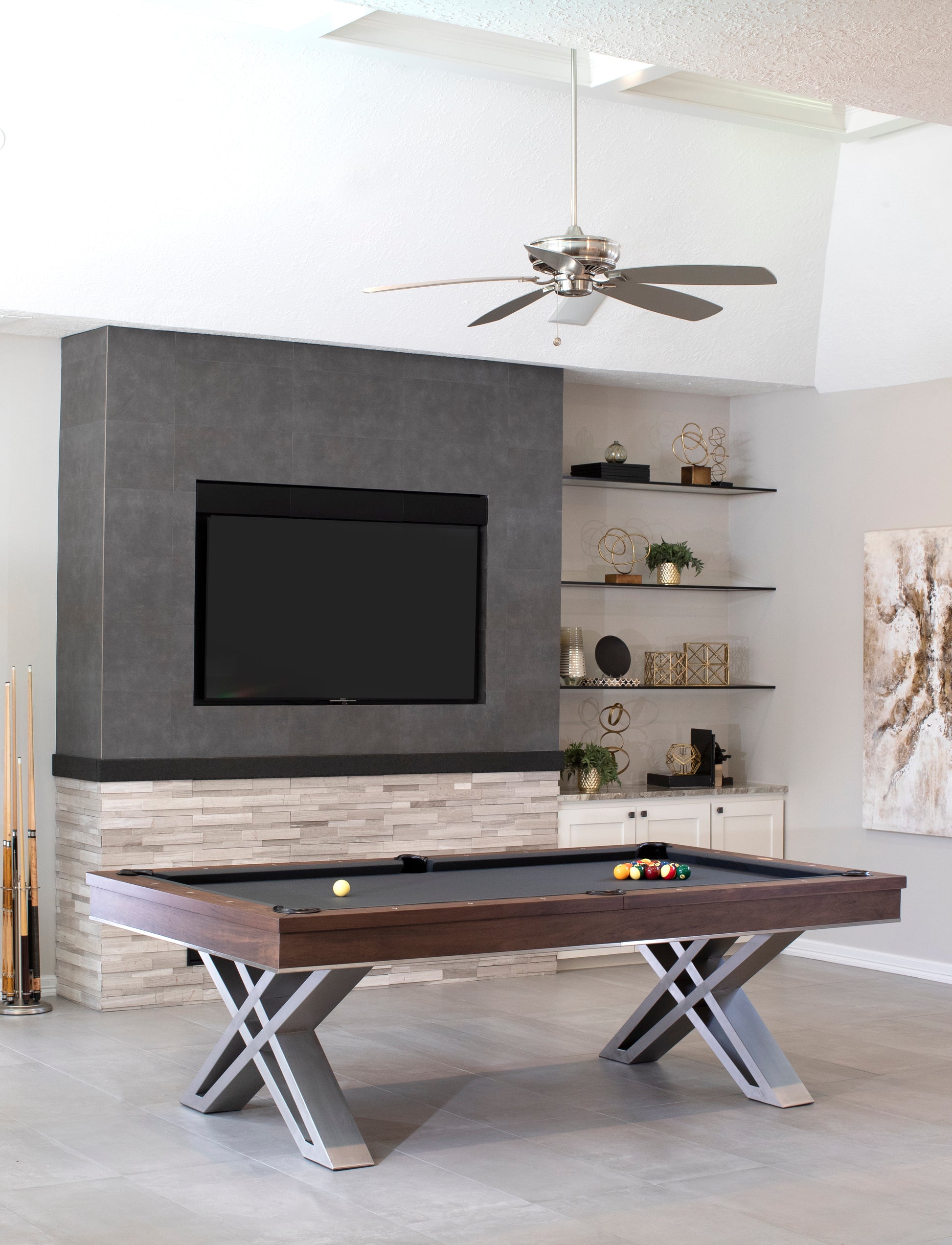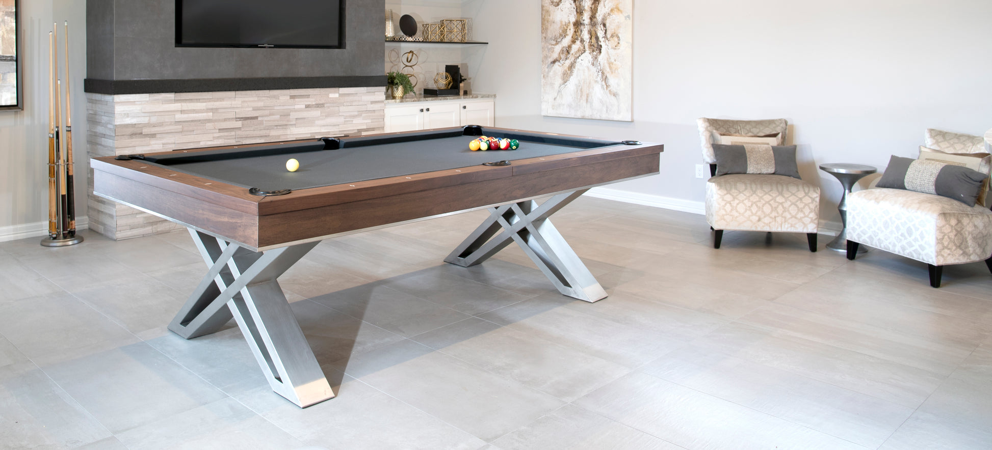 The Pierce is a modern pool table set off by bold stainless-steel legs and comes in a natural walnut finish. Includes standard cloth.