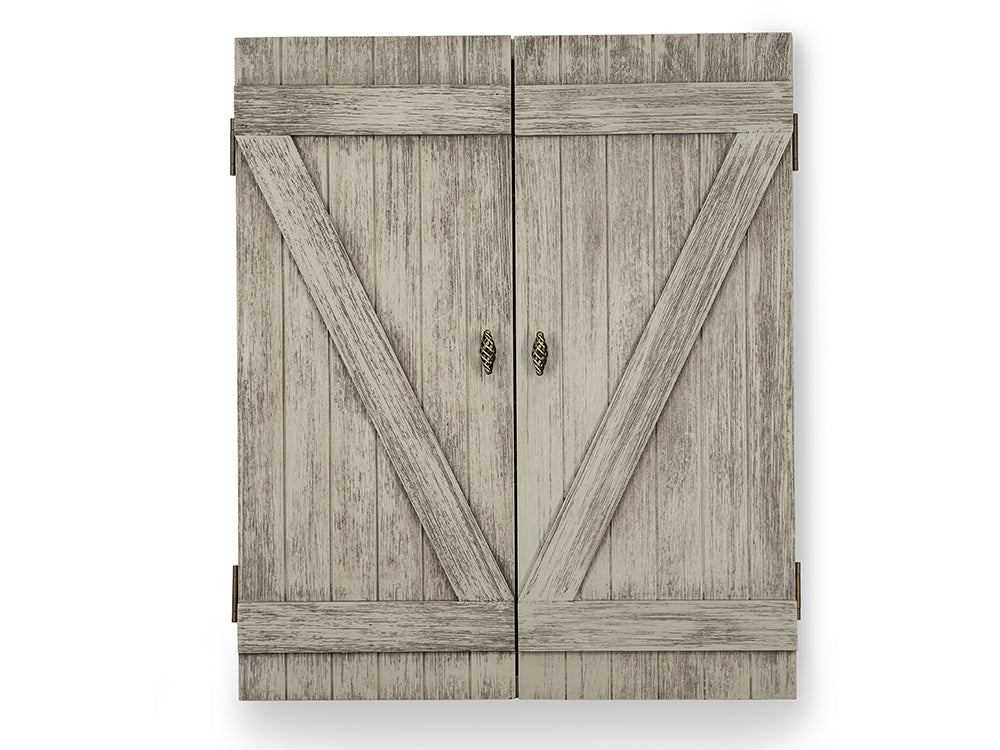- The Rustic dartboard cabinet is made of solid wood with barn-style doors