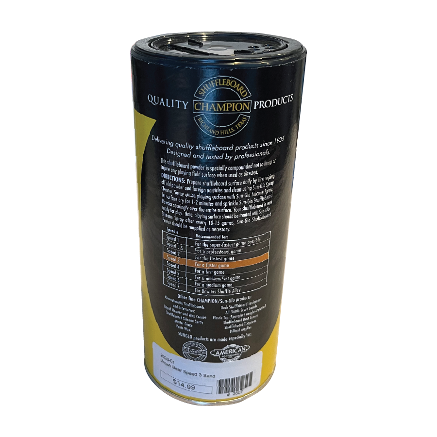 For an element of competition and a whole lot of fun, take your Shuffleboard game to the next level with Sun-Glo Shuffleboard Powder Speed 3 Brown Bear. This premium powder delivers a fast, smooth playing surface with its super fine texture, giving you the best shuffleboard experience around.