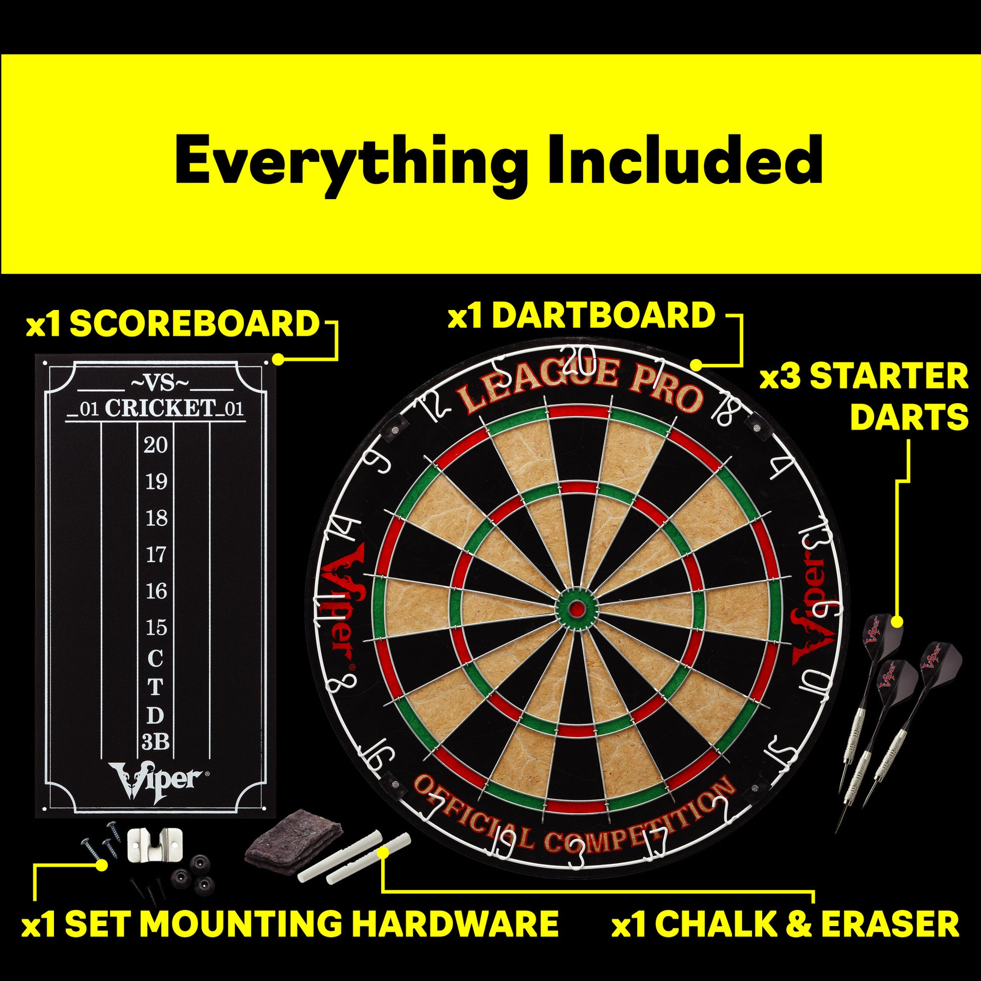 - Includes cricket scoreboard, chalk, eraser, mounting hardware and steel tip starter darts