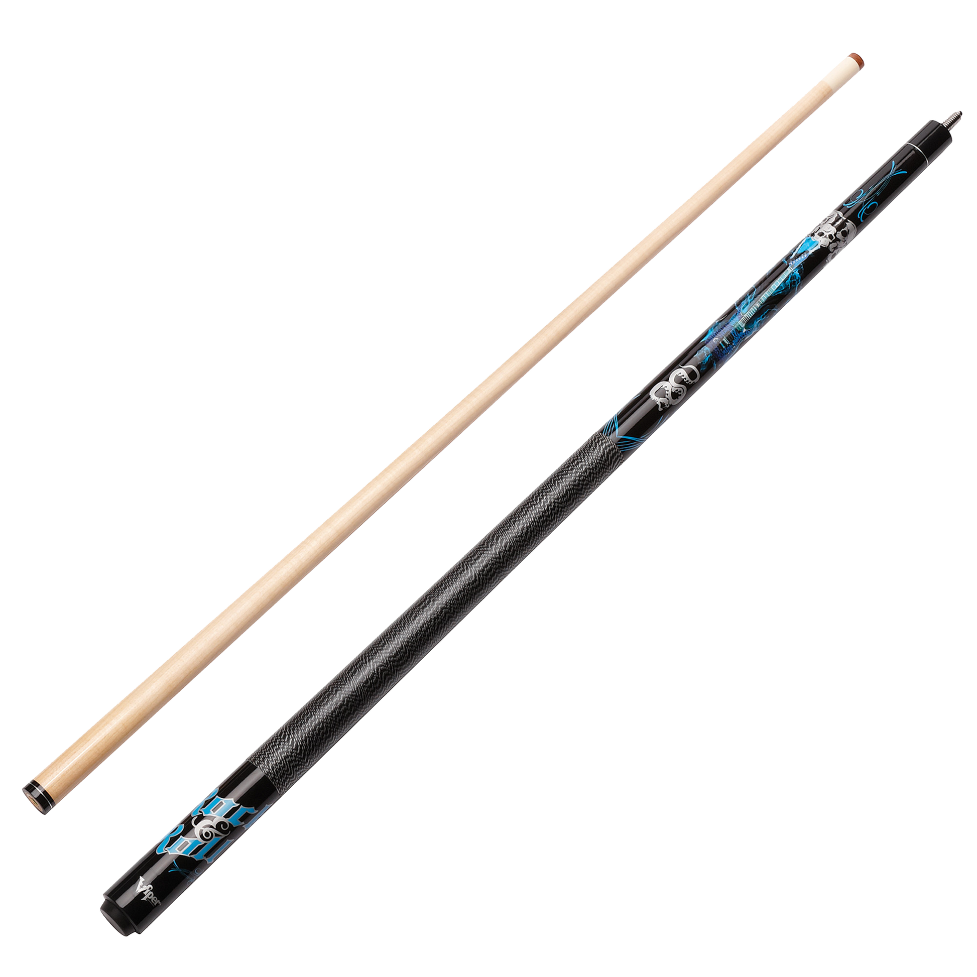 With a glowing blue guitar graphic, coiled snake, and bold lettering, this cue leans into its name. The black and grey butt is finished with a textured wrap that adds grip without getting in the way. Built from Canadian maple, it delivers a solid feel with the option to fine-tune your weight—great for everyday play with some visual punch.